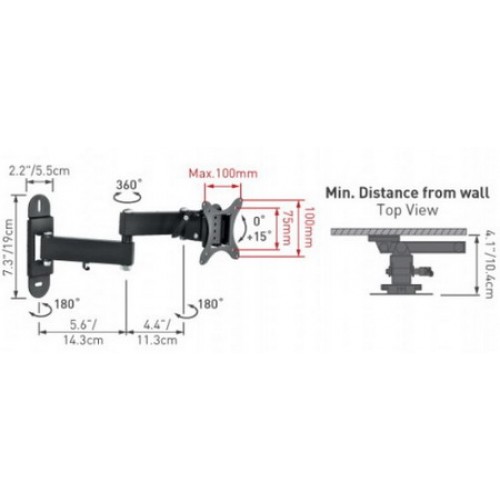 Кронштейн для настенного крепления ЖК телевизоров и компьютерных ЖК мониторов, 4 регулировки положения, расстояние от стены 10.2-34 см, максимальная нагрузка - 15 кг, адаптер VESA 75/75, 100/100. Цвет - Черный.
